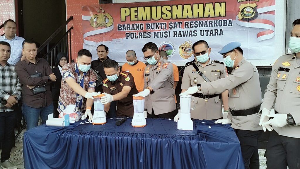MURATARA | DETAKNEWS – Polres Musi Rawas Utara (Muratara) kembali menunjukkan komitmennya dalam memberantas peredaran narkotika dengan memusnahkan barang bukti hasil pengungkapan kasus narkoba, Kamis (21/8/2025). Pemusnahan dilakukan di halaman Satnarkoba Polres Muratara dengan melibatkan jajaran kepolisian, Kejaksaan Negeri Lubuklinggau, tim Labfor, serta disaksikan penasihat hukum tersangka.