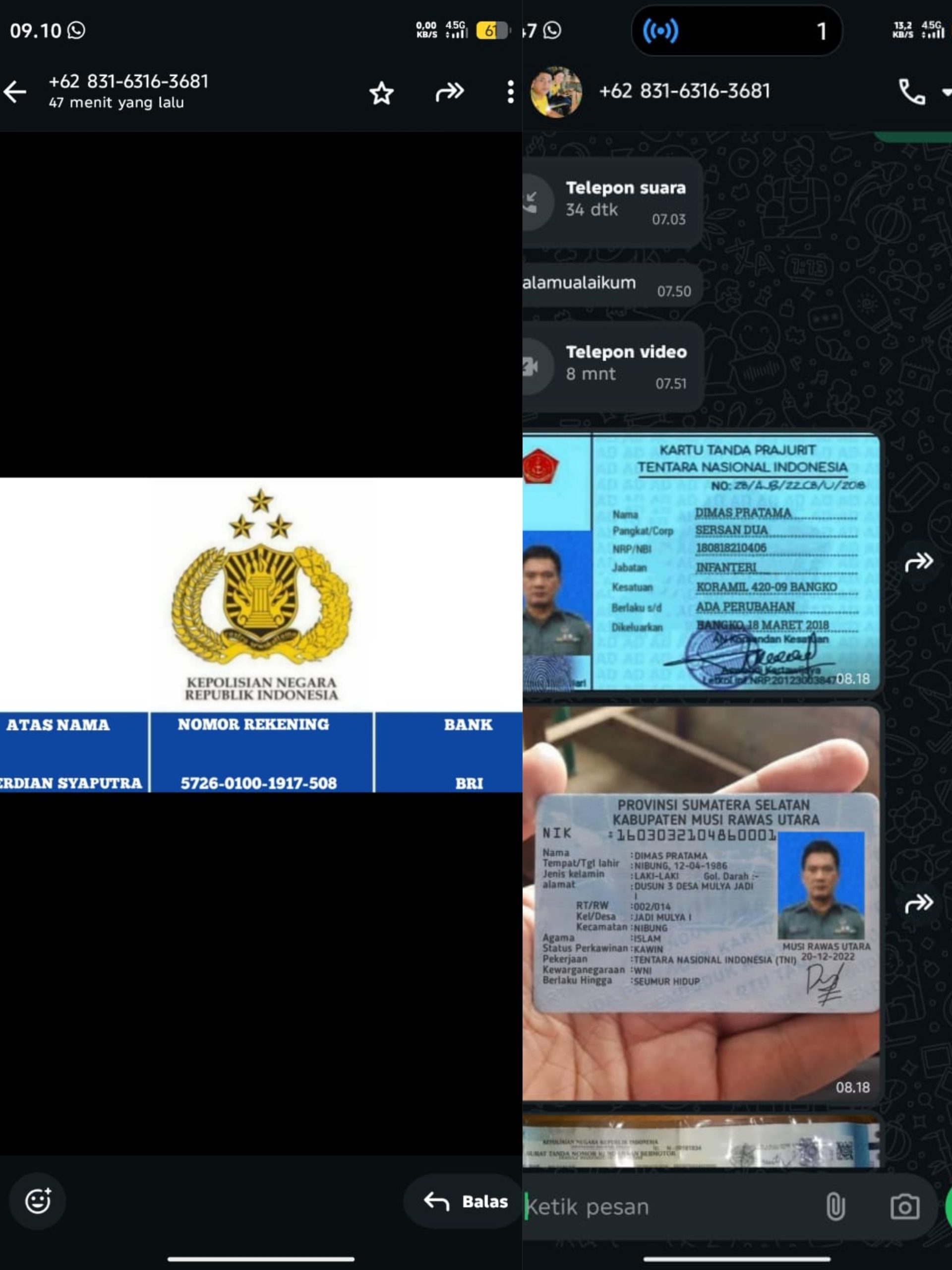 Yang lebih mencengangkan, komunikasi dengan korban dilakukan melalui nomor WhatsApp 0831-6316-3681 atas nama Dimas Pratama, yang mengaku sebagai anggota TNI AD berpangkat Sersan Dua dan berdinas di Koramil 420-09 Bangko. Klaim tersebut digunakan pelaku untuk menekan dan meyakinkan korban agar tidak ragu. Namun hingga kini, identitas dan status oknum tersebut belum dapat diverifikasi secara resmi.