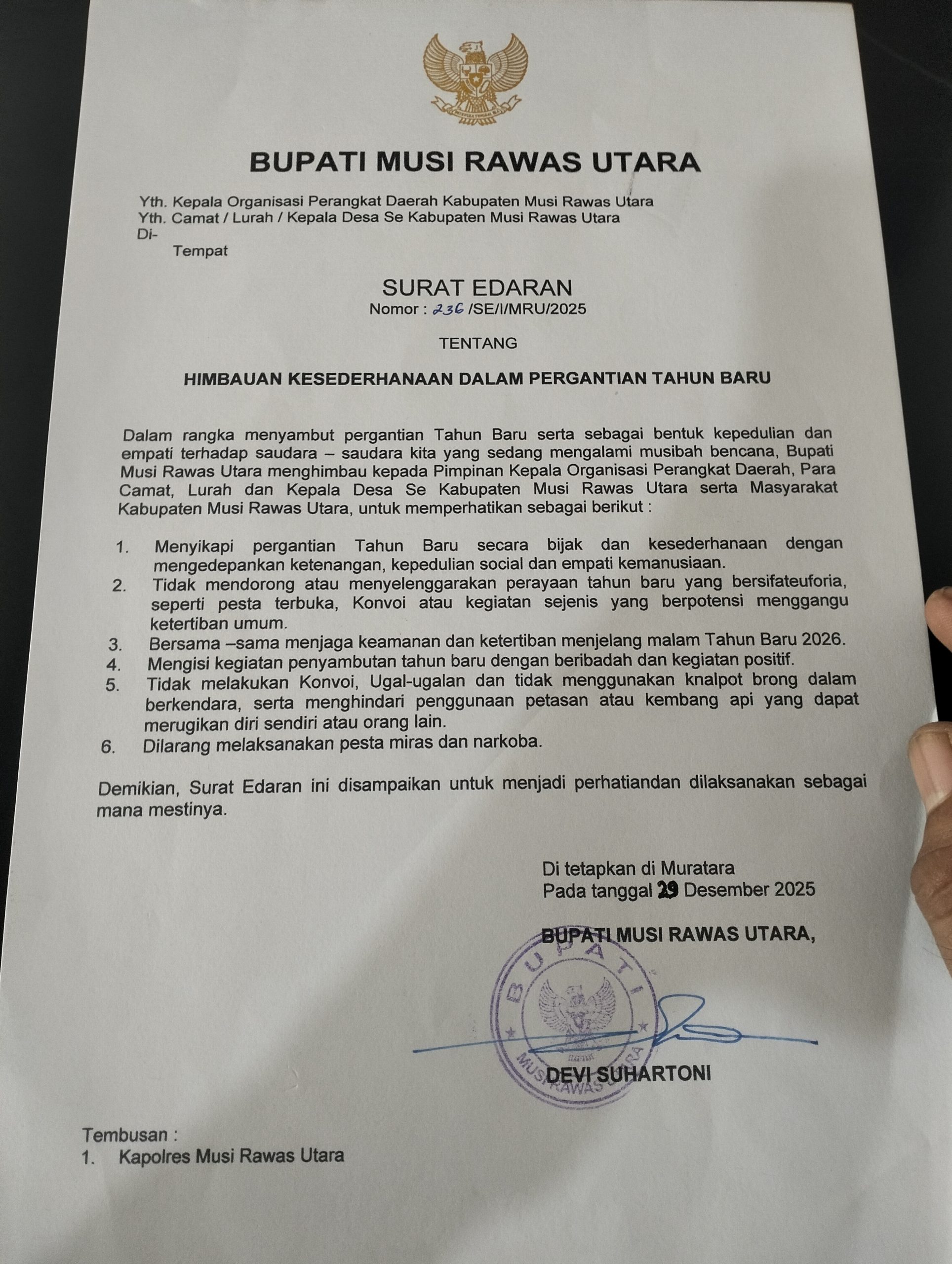 Surat edaran tersebut ditetapkan pada 29 Desember 2025 dan ditujukan kepada seluruh Kepala Organisasi Perangkat Daerah (OPD), Camat, Lurah, Kepala Desa, serta masyarakat Kabupaten Musi Rawas Utara.
