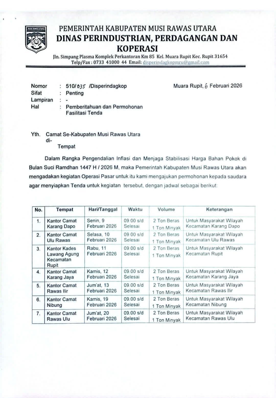 Kegiatan ini disampaikan melalui surat resmi Disperindagkop Muratara Nomor 510/035/Disperindagkop tertanggal 6 Februari 2026, yang ditujukan kepada seluruh camat se-Kabupaten Musi Rawas Utara.
